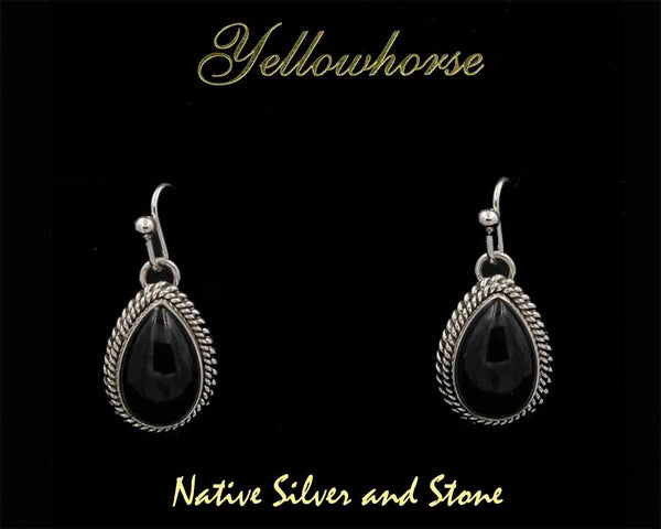 Beautiful handmade earrings featuring medium pear-shaped (teardrop) onyx with two layers of twist wire around the perimeter.