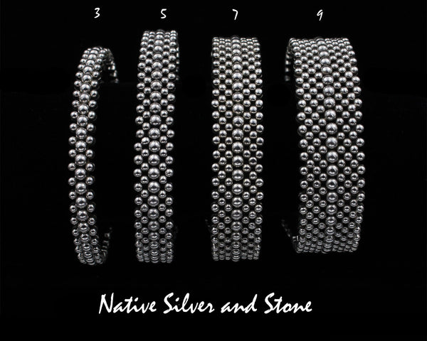 This stunning cuff features startlingly detailed work. It's a real feat of master silver-work to make these handmade beads. Obviously, the more rows, the greater the difficultly in achieving consistency.