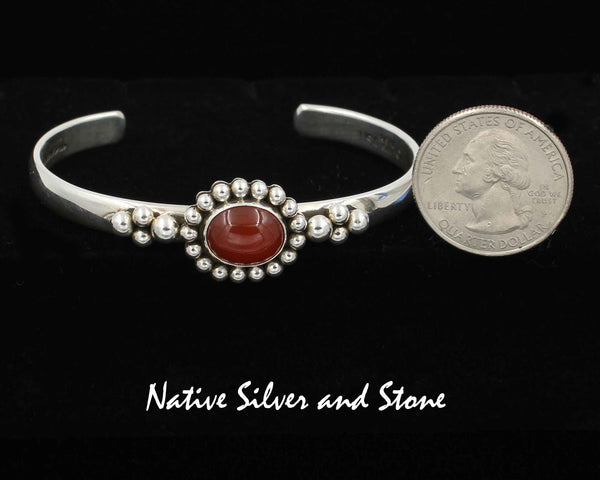 A beautiful little deep red Carnelian and Bead cuff for those who can't or won't wear the bigger pieces. Artie's classic silver beaded perimeter with added bead accents.