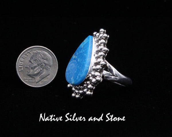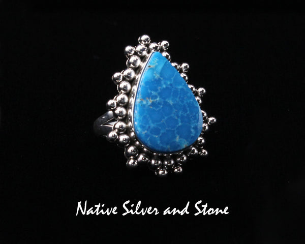 Wow! What a beauty this one is! It really stands out. One-of-a-kind made of bright blue turquoise. Set in the outstanding burst bead design.