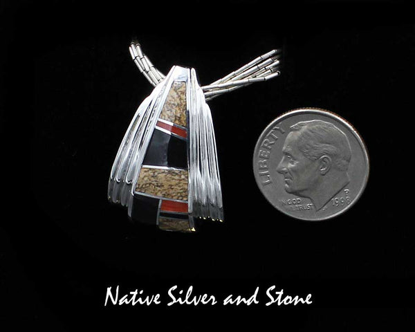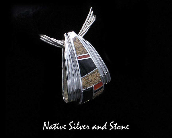 Beautiful Navajo handmade in New Mexico. Multi-inlay of Matrixed Blue Kingman Turquoise, Purple Spiny Oyster, Opal, Sierra Black-rock set in Sterling Silver. Total drop: 1". Pendant Inlay: 1/2" H .x...