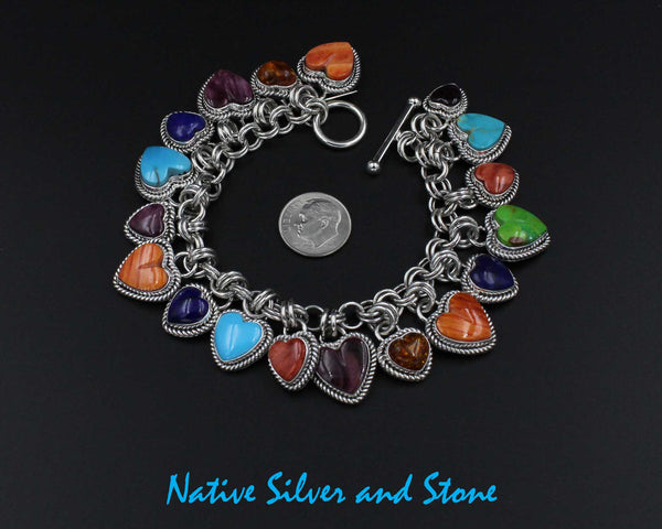 Materials: (18) Hearts. Orange Spiny, Purple Spiny, Turquoise, Lapis, Amber, Gaspiete, and Sterling Silver