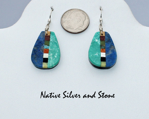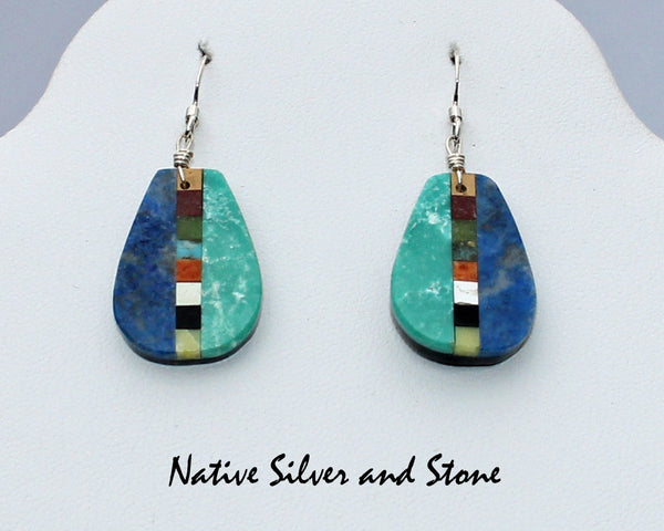 Materials: Denim Lapis (medium blue), Turquoise, Serpentine (dark green), Pipestone, Apple Coral (orange), Jet (black)